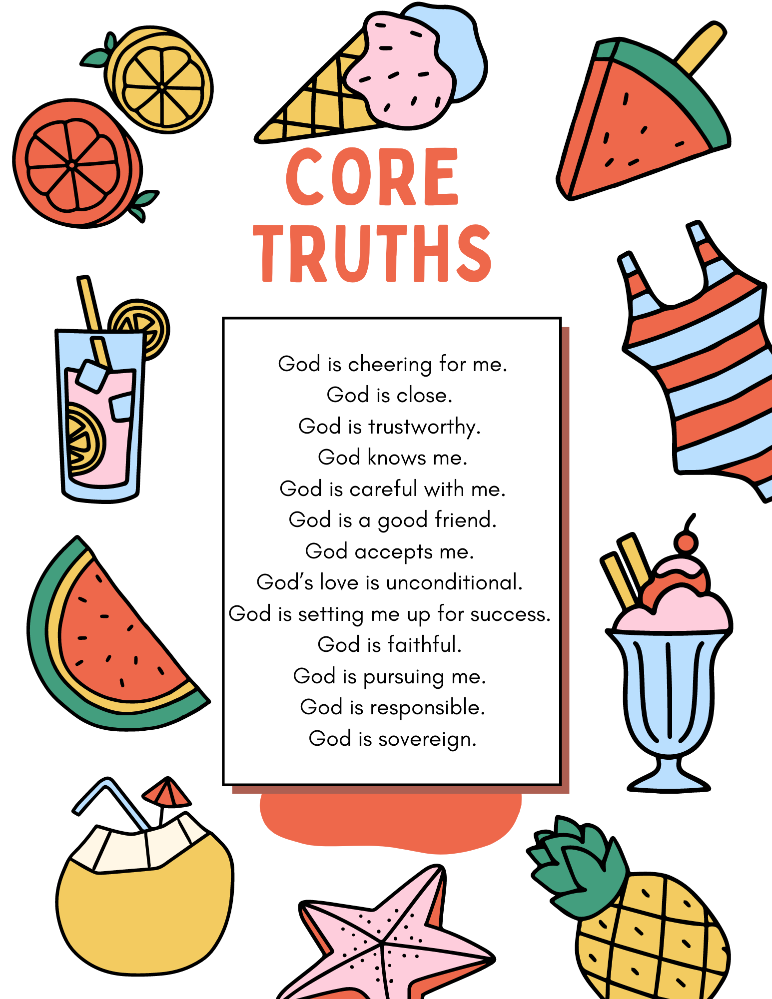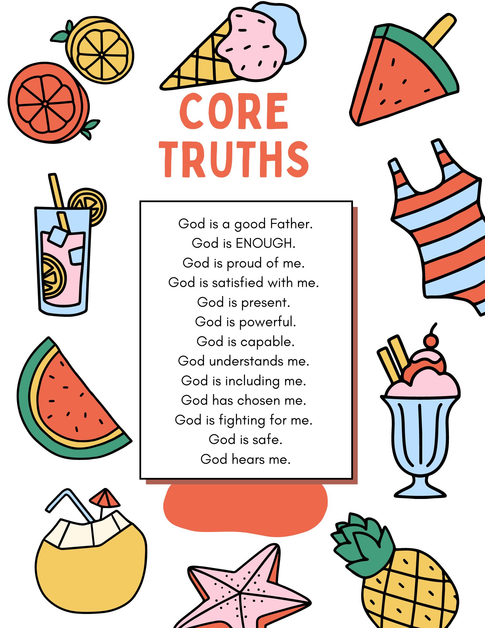 Below are some core truths that I have posted in my home. I received this list from a retreat I went to a year ago, and I made a summer-themed graphic just for this!